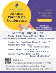 Rock Springs #FamilyLife Ministry will be hosting the 5th Annual Parent Life Conference. Parents, grandparents, and legal guardians for babies – 18 years old are urged to attend. Childcare provided is for ages birth – 5th grade.